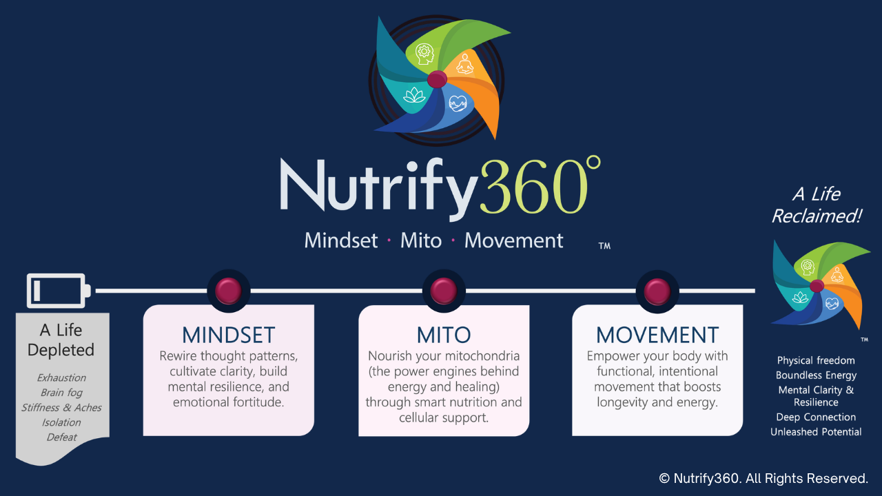 As you apply the pillars of Mindset Regulation, Mitochondrial Fueling, and Mindful Movement, the pinwheel begins to turn. What started as a struggle becomes momentum. This is the "New Way"—an empowered, integrative, and thriving existence where health isn't just something you manage, but the energy that fuels your life's work.
